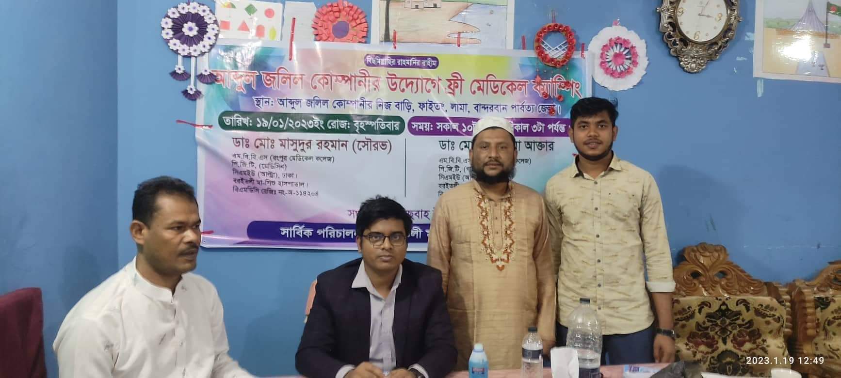 আর্তমানবতার সেবায় রোগমুক্ত ও সুস্থ ইউনিয়ন গড়ার প্রত্যয়ে বান্দরবানের লামা উপজেলার ফাইতং ইউনিয়নের কৃতি সন্তান, বিশিষ্ট সমাজসেবক,জনবান্ধব ও দায়িত্বশীল একজন সফল মানুষ জননেতা আব্দুল জলিল কোম্পানির মানবিক উদ্যোগে ৩'শত হতদরিদ্র অসহায় নারী-পুরুষকে ফ্রি চিকিৎসা সেবা প্রদান করা হয়েছে।
