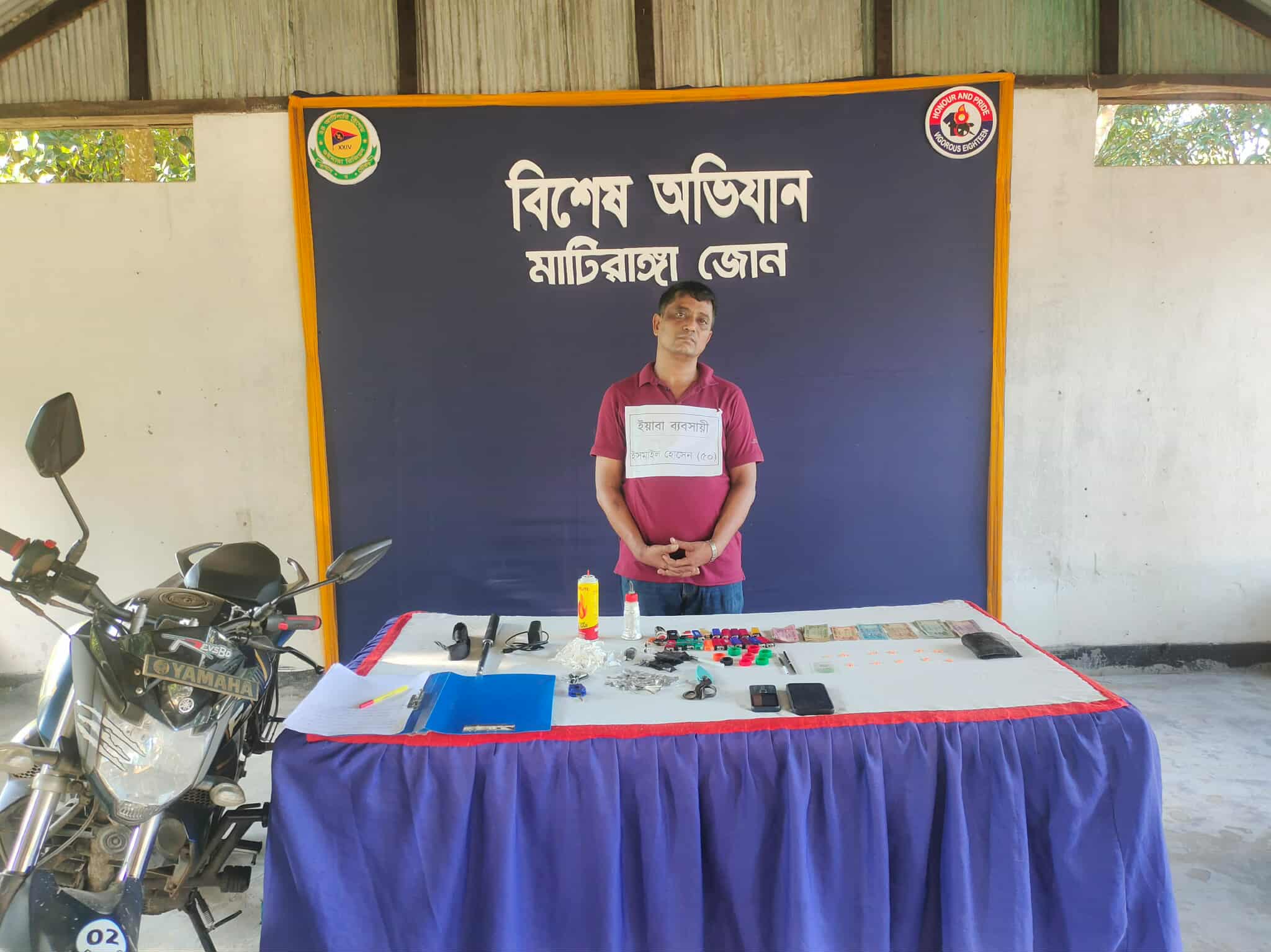 উদ্ধারকৃত সরঞ্জামঃ ইয়াবা-৫৩ পিস, গ্যাস লাইট-২১ টি, নগদ টাকা -৪৭৬০/=, ইয়াবা কন্ট্রোলার-১৮ পিস, ড্রাইভিং লাইসেন্স -০১টি, গ্যাস লাইটার ফিলিং বোতল-০১ টি, মোবাইল ফোন-০২টি ( এ্যান্ড্রয়েড -০১, বাটন-০১), মোবাইল চার্জার-০১ টি, মানি ব্যাক-০১টি, স্টাম স্টিক-০১টি, মোটরসাইকেল এফজেড(ভার্সন-২)-০১ টি, সিজার-০১ টি, বাতি-০১টি।