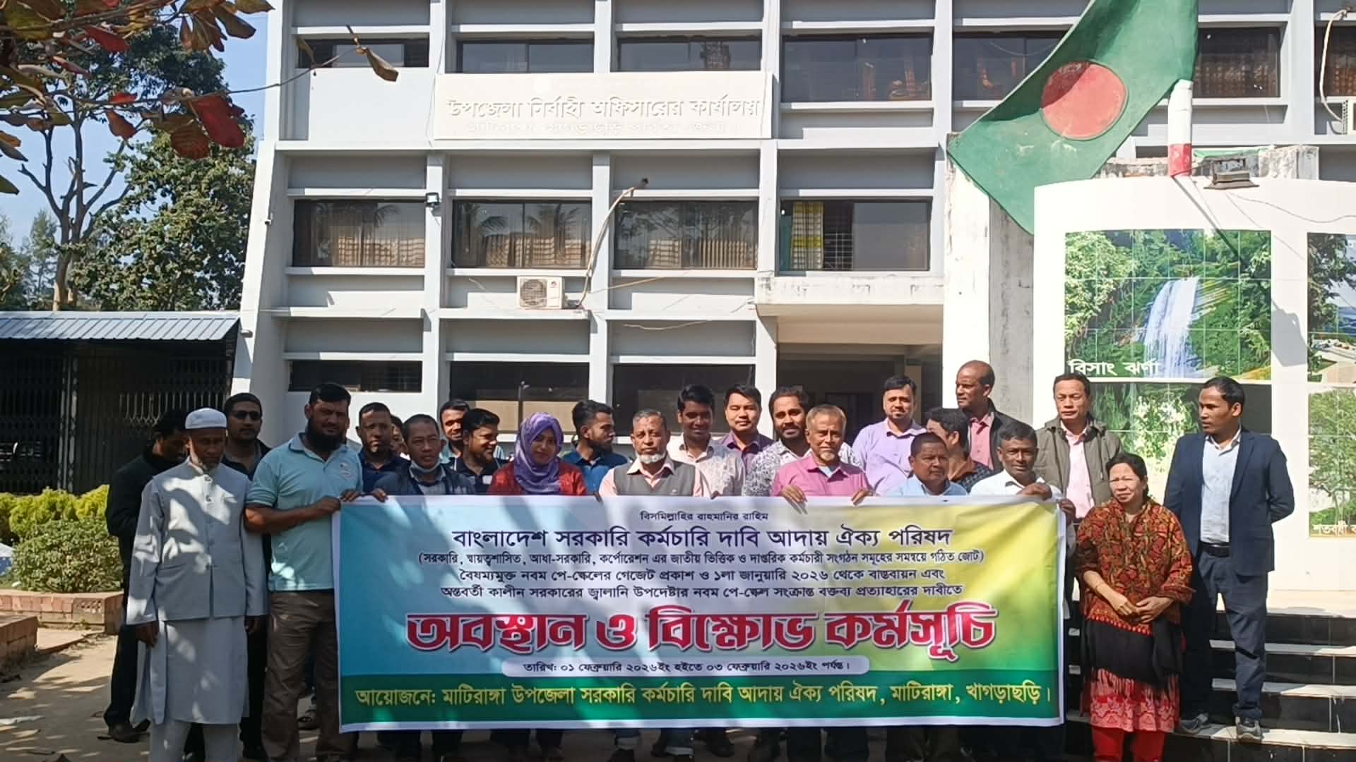 সরকারি, স্বায়ত্তশাসিত, আধা-সরকারি, কর্পোরেশনের জাতীয়ভিত্তিক ও দাপ্তরিক কর্মচারী সংগঠন সমূহের সমন্বয়ে গঠিত জোট) বৈষম্যমুক্ত নবম পে-স্কেলের গেজেট প্রকাশ ও ১লা জানুয়ারি ২০২৬ থেকে বাস্তবায়ন এবং অন্তর্বর্তীকালীন সরকারের জ্বালানি উপদেষ্টার নবম পে-স্কেল সংক্রান্ত বক্তব্য প্রত্যাহারের দাবিতে কেন্দ্রীয় কর্মসূচির অংশ হিসেবে খাগড়াছড়ির মাটিরাঙ্গায় অবস্থান কর্মসূচি ও বিক্ষোভ সমাবেশ করেছে 'বাংলাদেশ সরকারি কর্মচারী দাবি আদায় ঐক্য পরিষদ' মাটিরাঙ্গা উপজেলা শাখা।