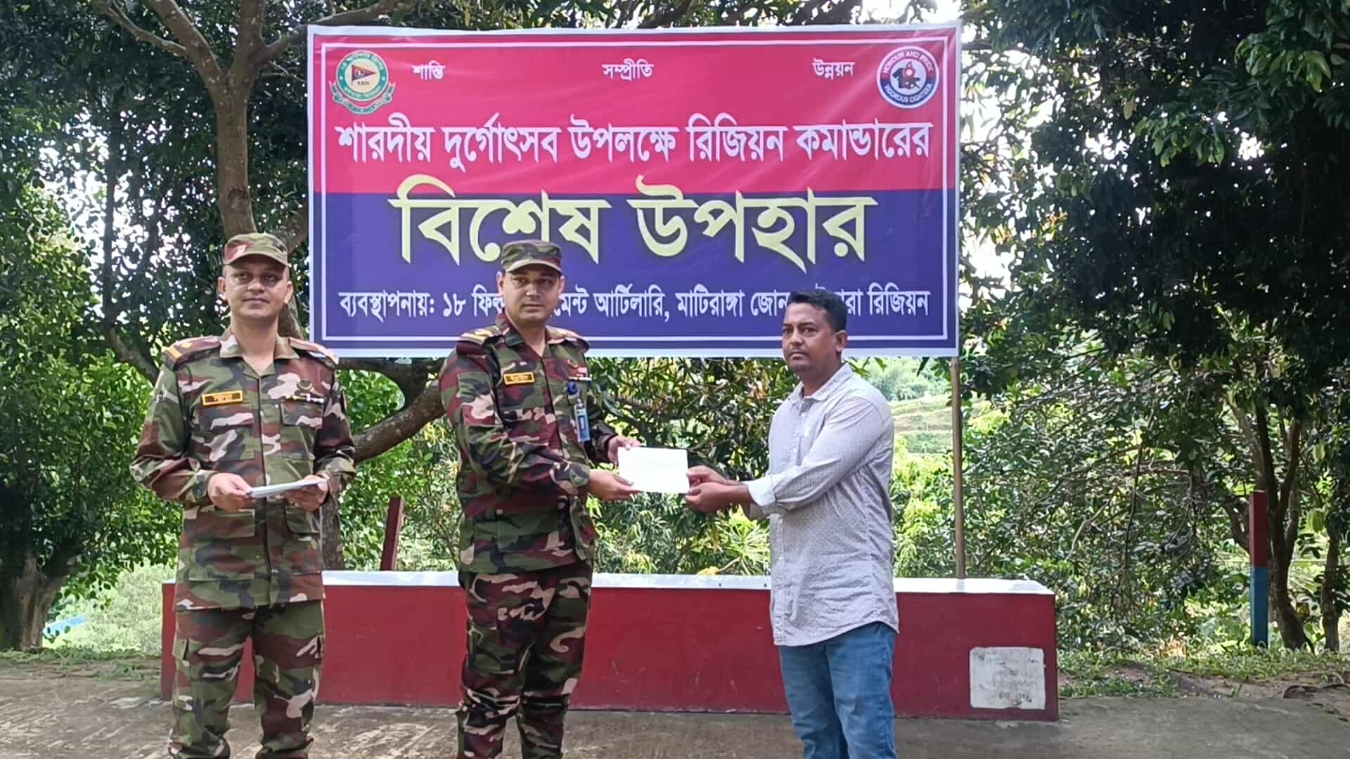 ২৪ সেপ্টেম্বর ২০২৫ সকাল ১০:০০ দিকে গুইমারা রিজিয়নে অধীনস্থ মাটিরাঙ্গা সেনা জোন সদরে শারদীয় দুর্গোৎসব উপলক্ষে ব্রিগেডিয়ার জেনারেল মোঃ আবুল কালাম শামসুদ্দিন রানা পিবিজিএম, এনডিসি, এএফডব্লিউসি, পিএসসি, জি, রিজিয়ন কমান্ডার, গুইমারা রিজিয়ন এর পক্ষে মাটিরাঙ্গা কমান্ডার জোন কমান্ডার লেপ্টেন্যান্ট কর্নেল ইব্রাহিম আধহাম পিএসসি জি উপজেলার ৬টি পূজা উদযাপন কমিটির সভাপতিগনের নিকট ২৫ হাজার টাকা করে সর্বমোট এক লক্ষ পঞ্চাশ হাজার টাকার চেক হস্তান্তর করেন ।